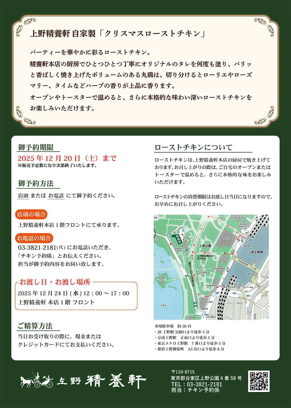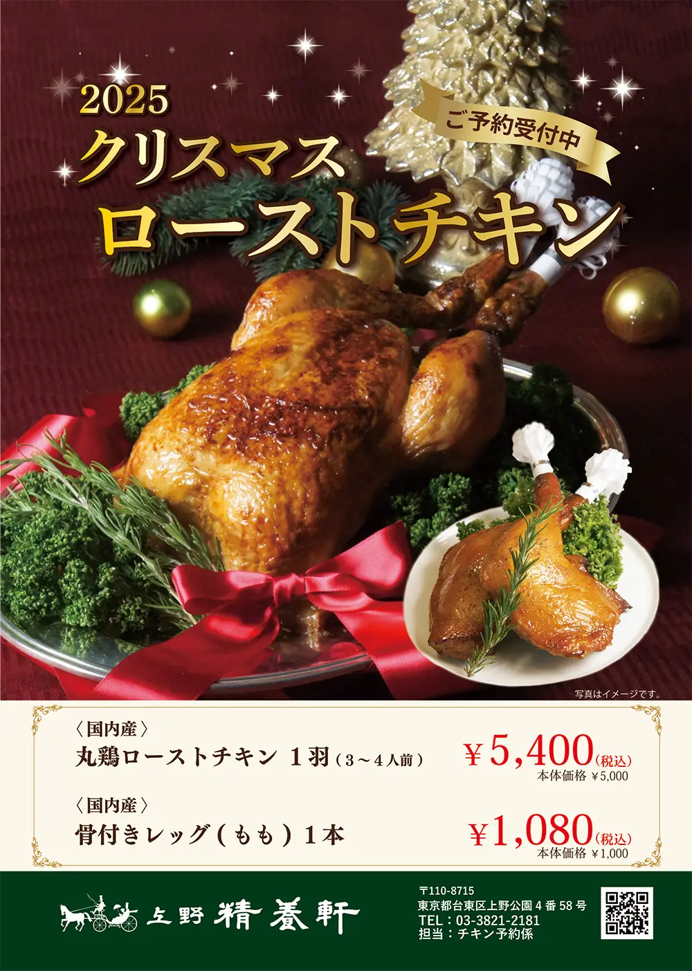 お電話の場合:03-3821-2181(代) 「チキン予約係」とお伝えください。
